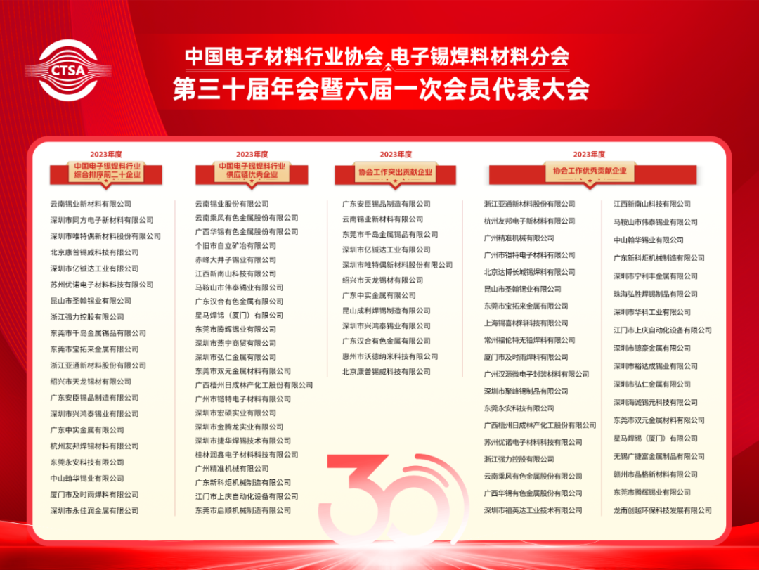 中国电子材料行业协会电子锡焊料材料分会第三十届年会暨六届一次会员代表大会圆满召开由衷感谢广大参会人员的积极支持。